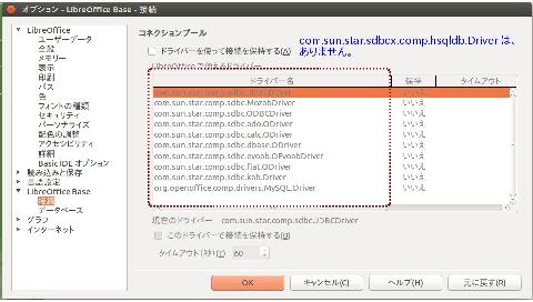 このように、LibreOfficeで使えるドライバーとしてcom.sun.star.sdbcx.comp.hsqldb.Driverの表示がありません。