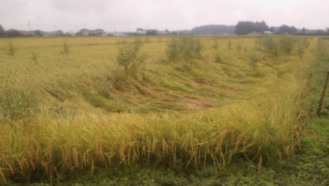 更に、肥料 (化学肥料と思います) のやり過ぎも考えものです。水を完全に切る時期を間違ったり、刈り入れ時期が遅くなったりすると、倒伏が激しくなるみたいです。